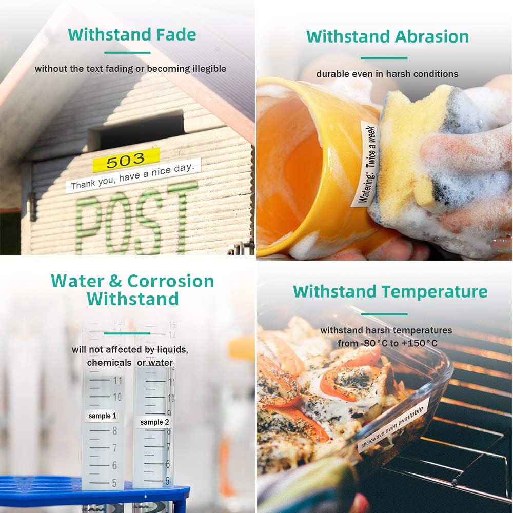 - Durable Replacement for Brother P-touch Label Maker Tape: Ptouch TZe strong adhesive laminated tape is suitable for indoor or outdoor use, even in harsh weather conditions. Withstand water, abrasion, temperature , grease, grime, and will not fade, smudge or smear.