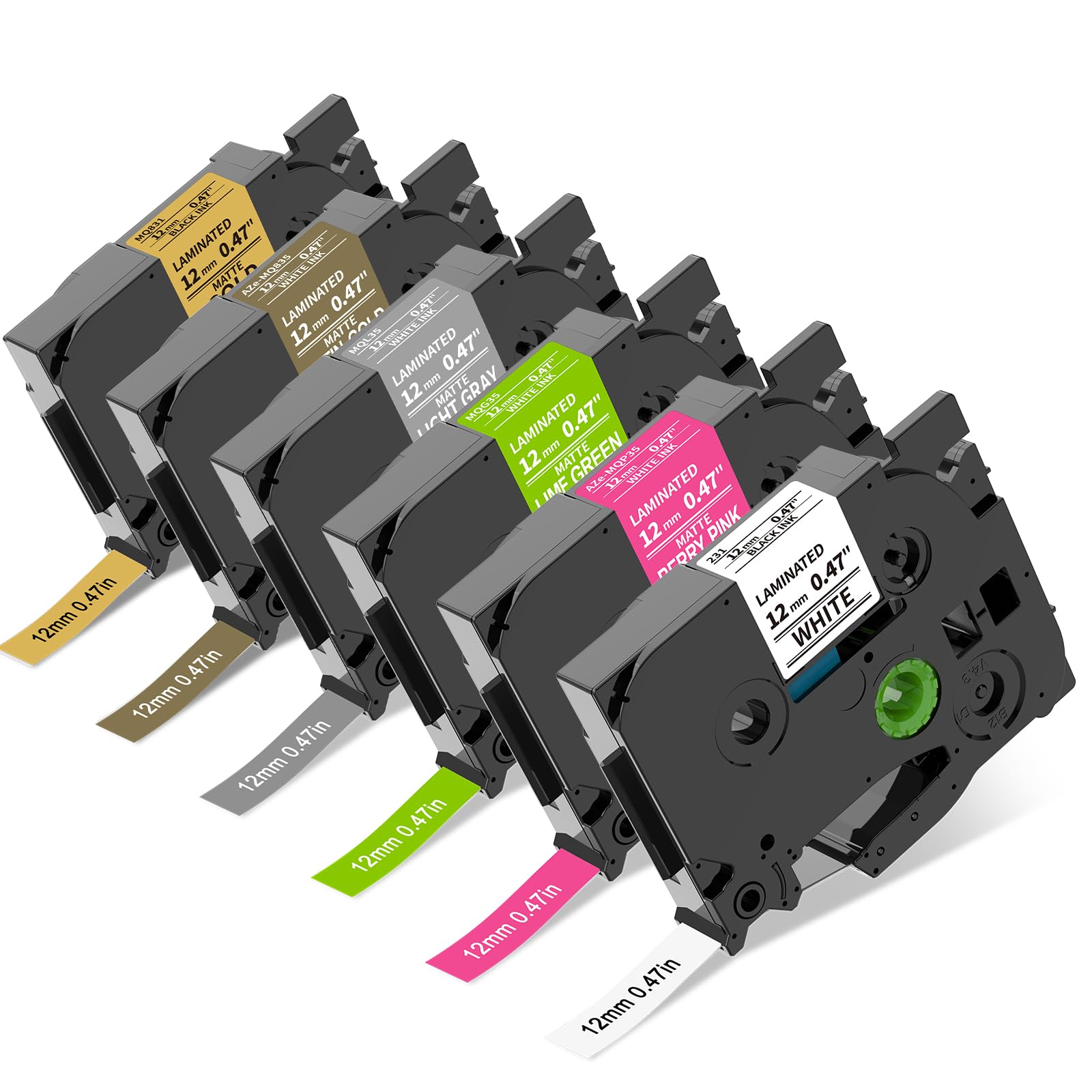 - Package Include: 6-Pack. Width for each tape: 1/2'' (12mm). Length for each tape: 26.2' (8m). 6 Colors in one set: Black on White (Equivalent Brother TZe-231), White on Berry Pink (Equivalent TZe-MQP35), White on Lime Green (Equivalent Brother TZe-MQG35), White on Matt Light Grey (Equivalent Brother TZe-MQL35), Black on Satin Gold (Equivalent Brother TZe-MQ831), White on Satin Gold (Equivalent Brother TZe-MQ835)